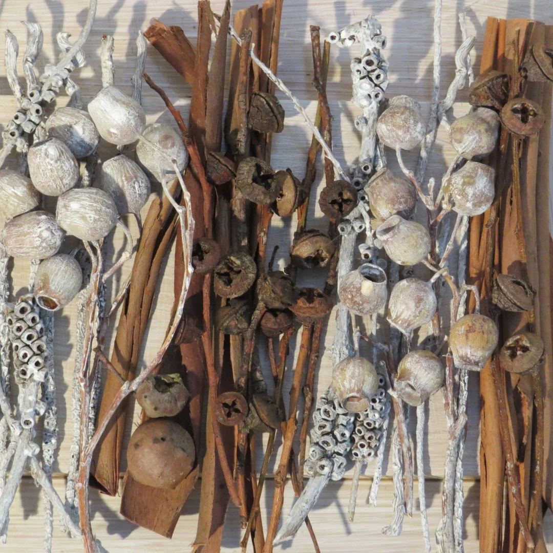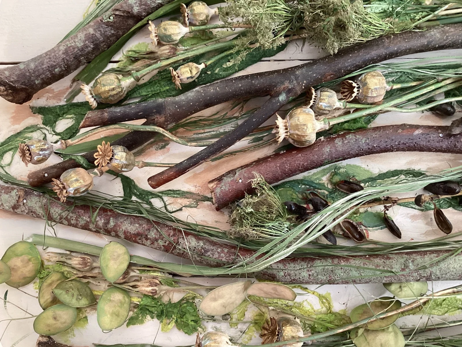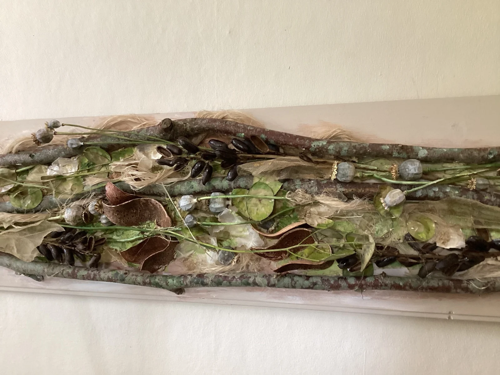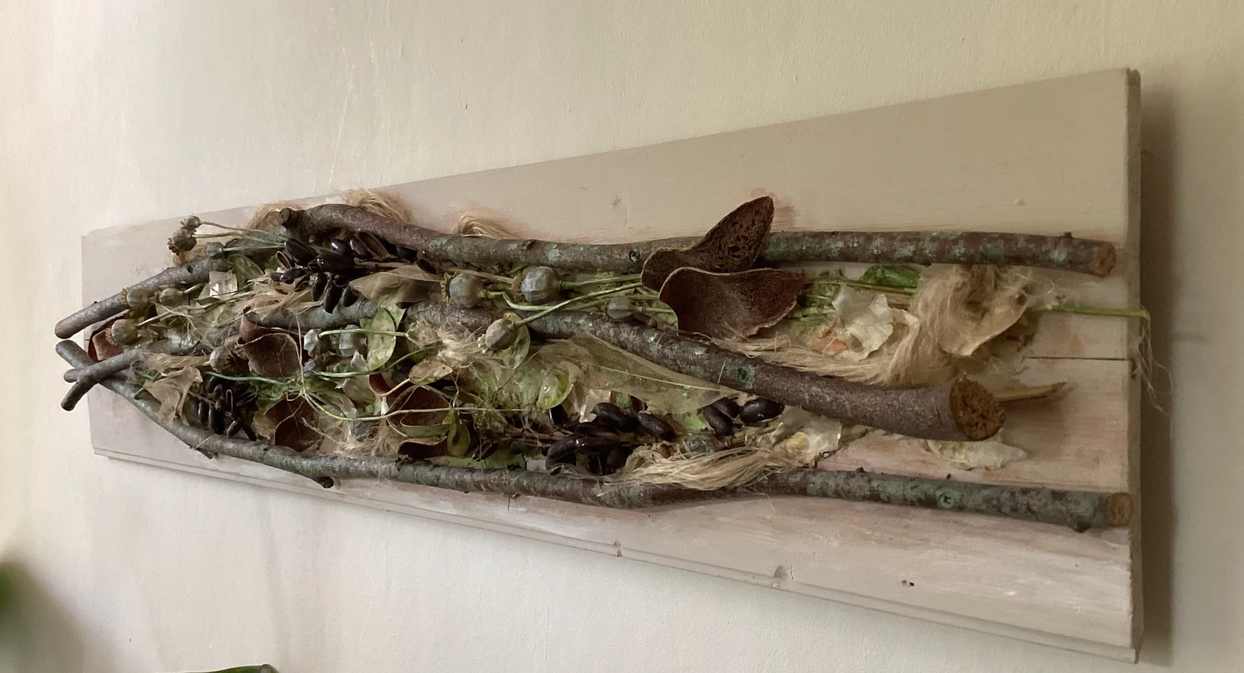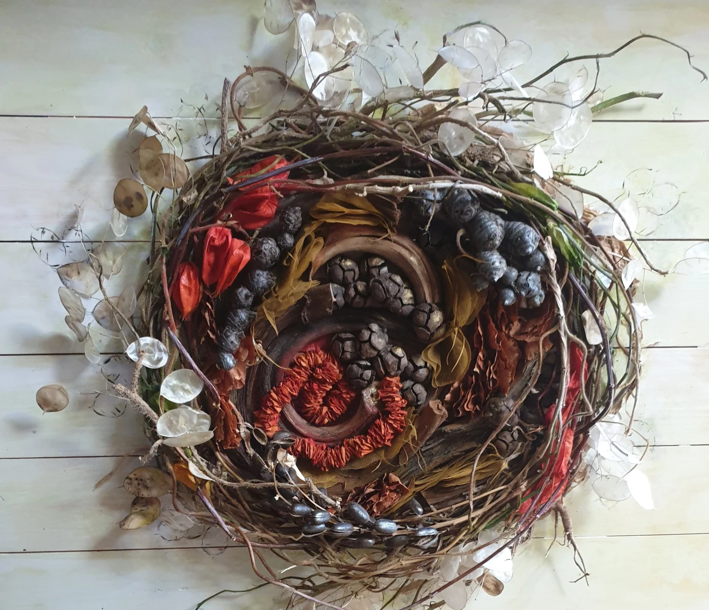 Met natuurlijke materialen zoals blad, schors, zaaddozen en takken maak ik composities.