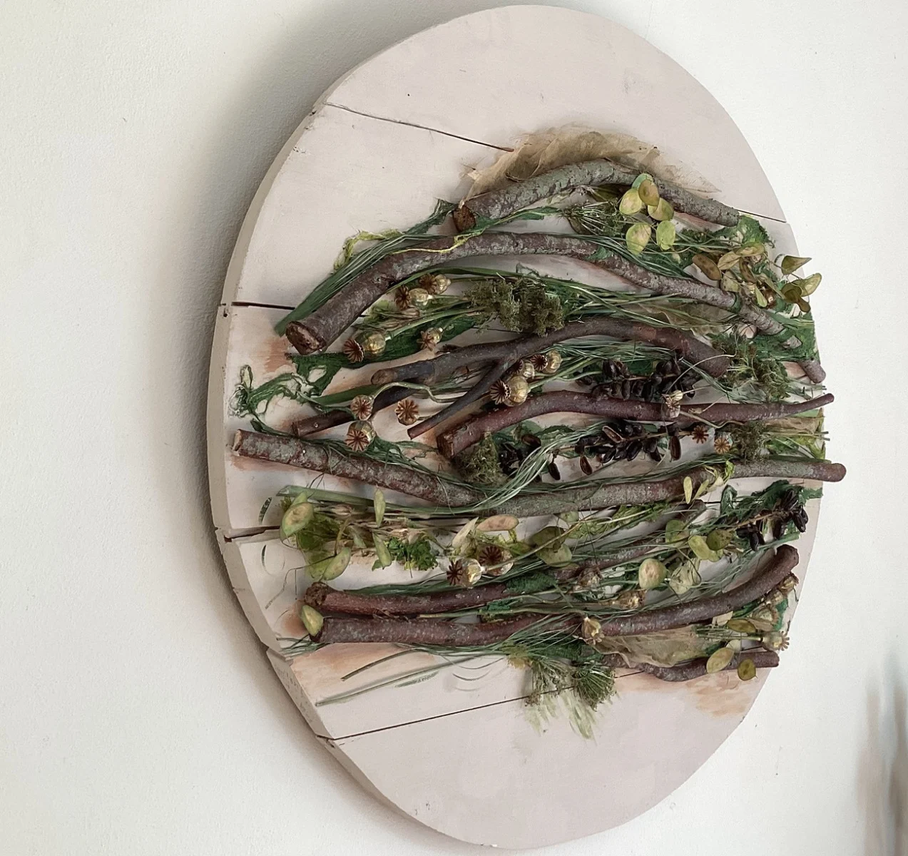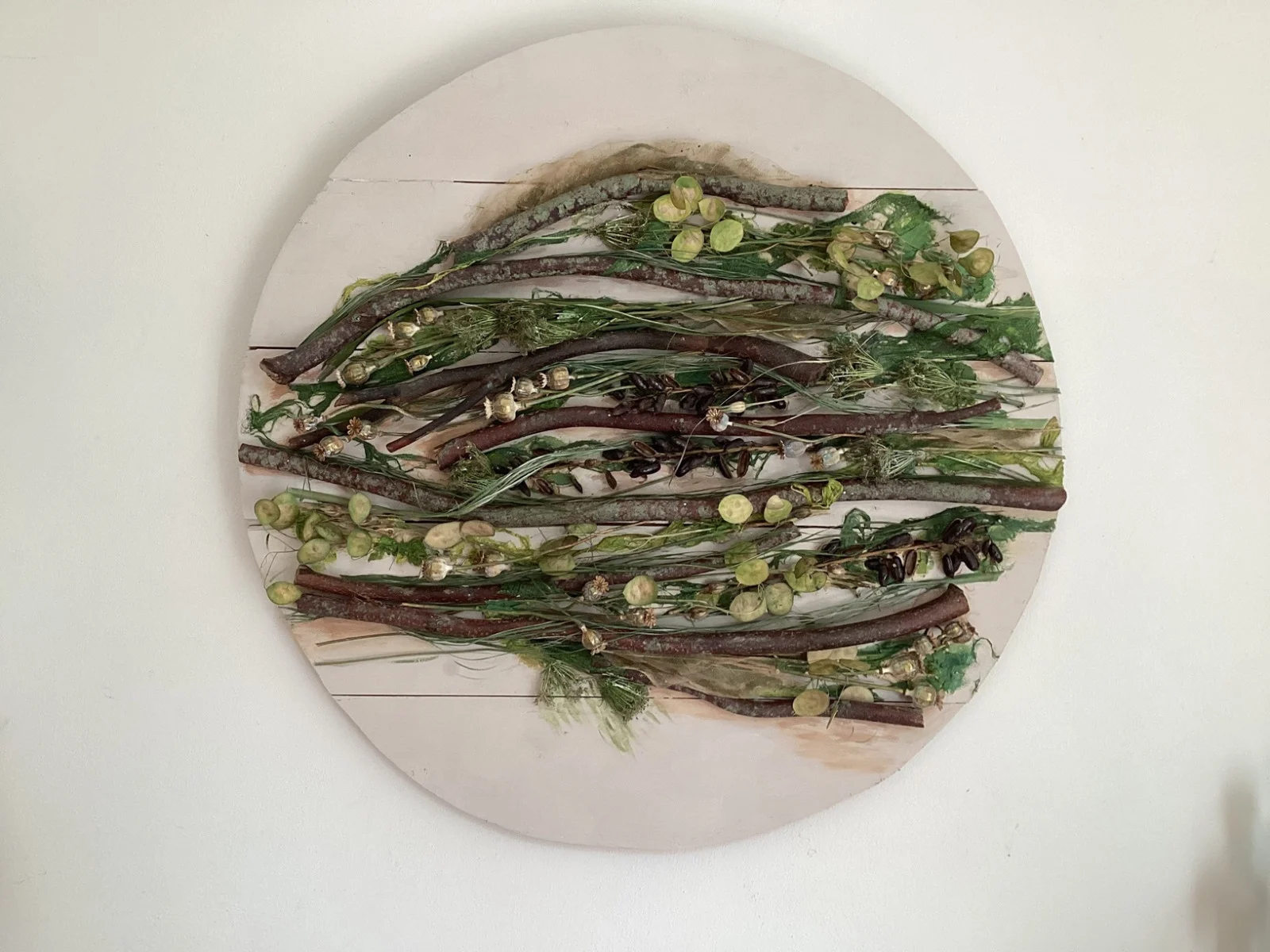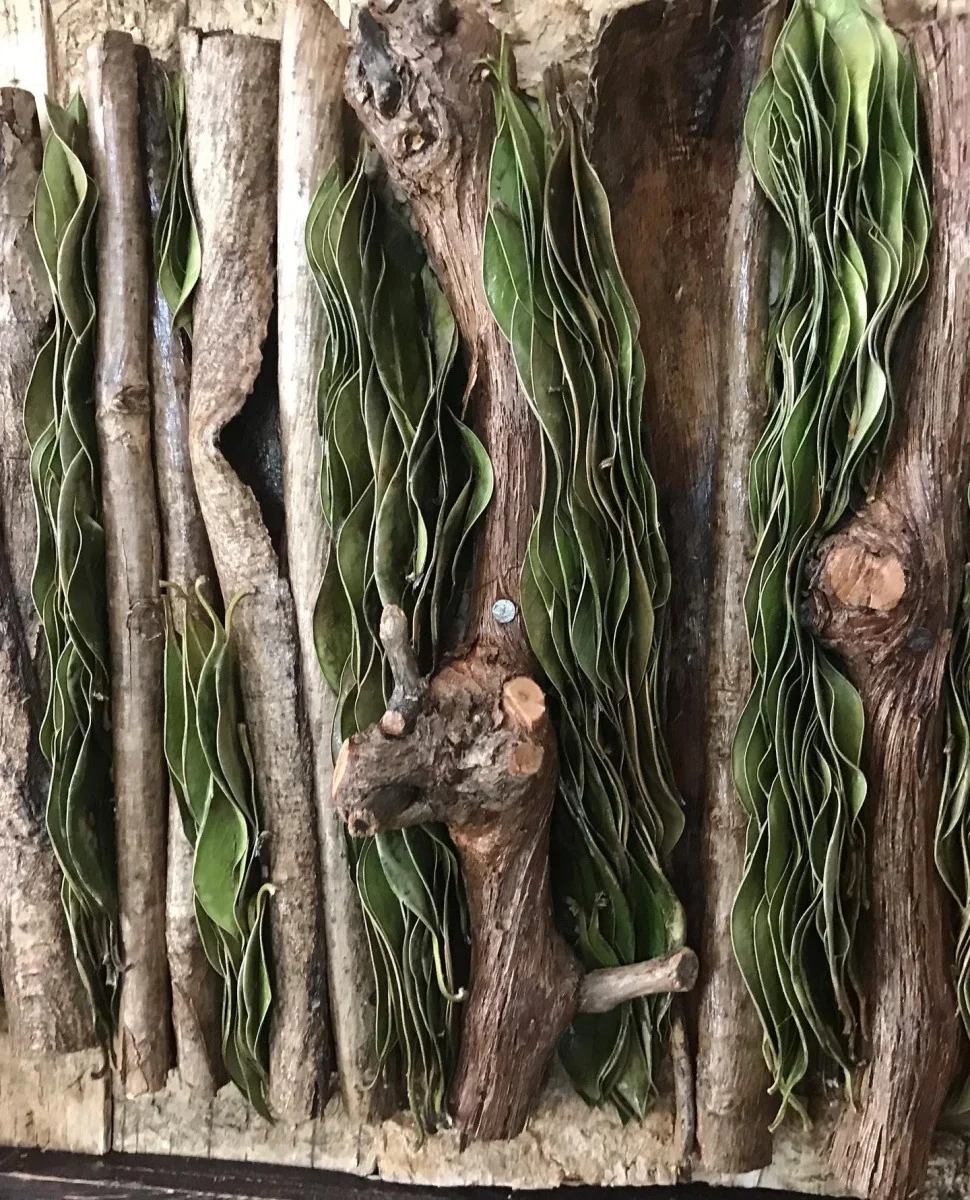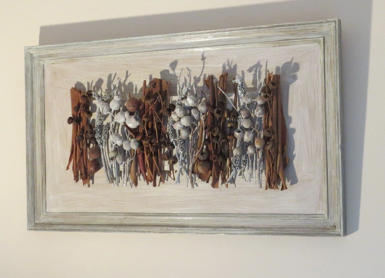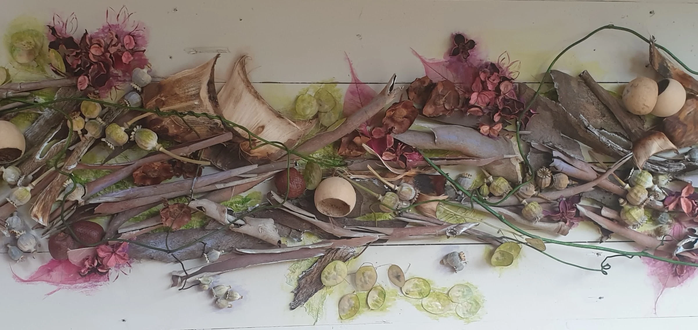 Met natuurlijke materialen zoals blad, schors, zaaddozen en takken maak ik composities.