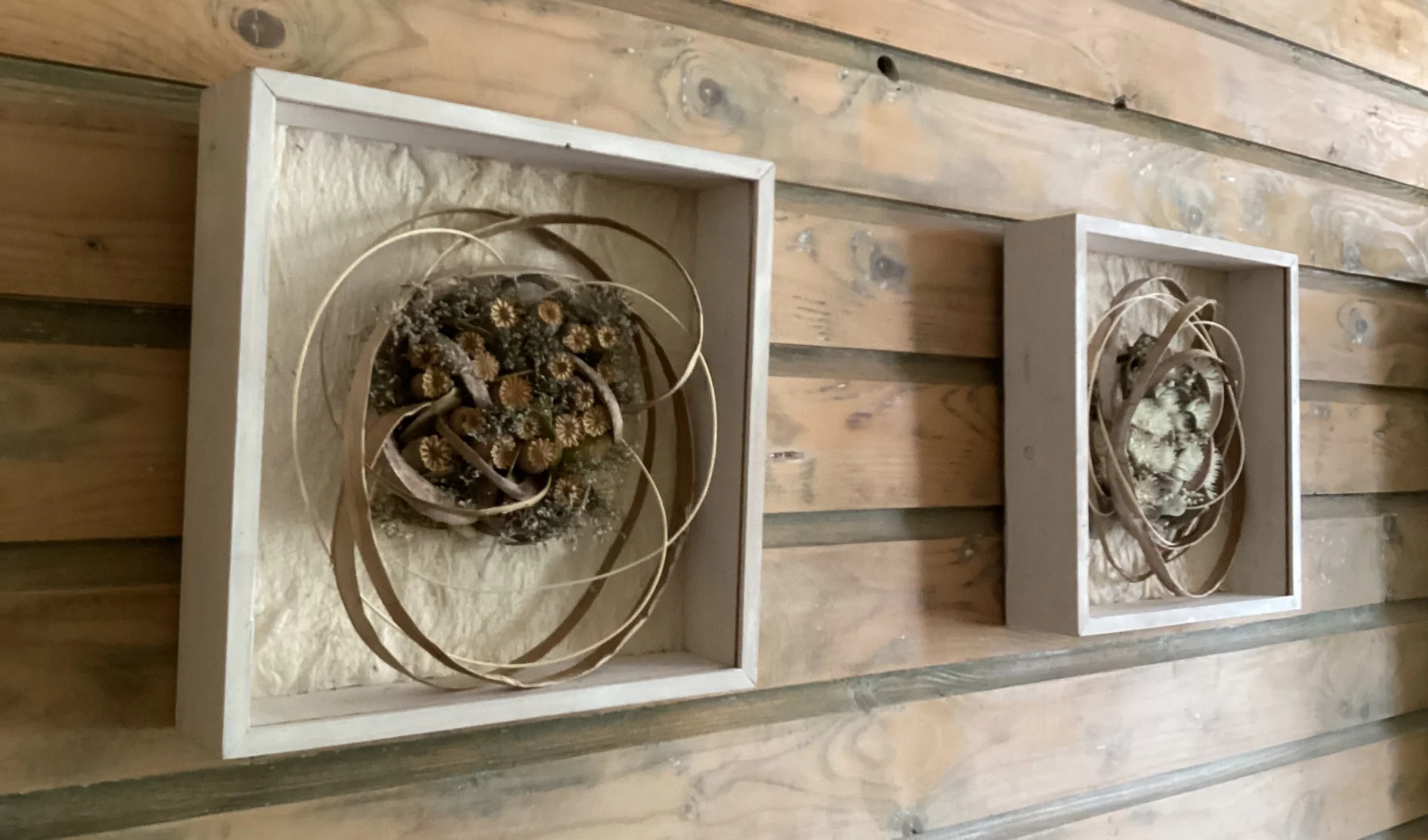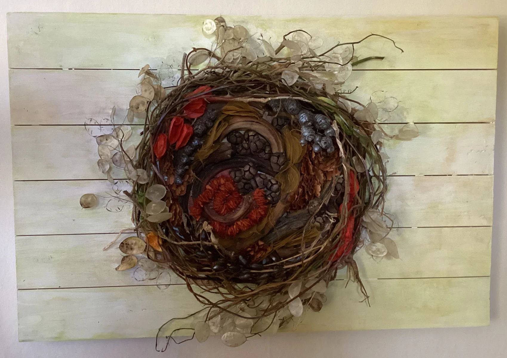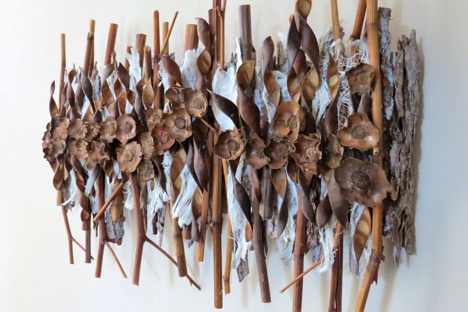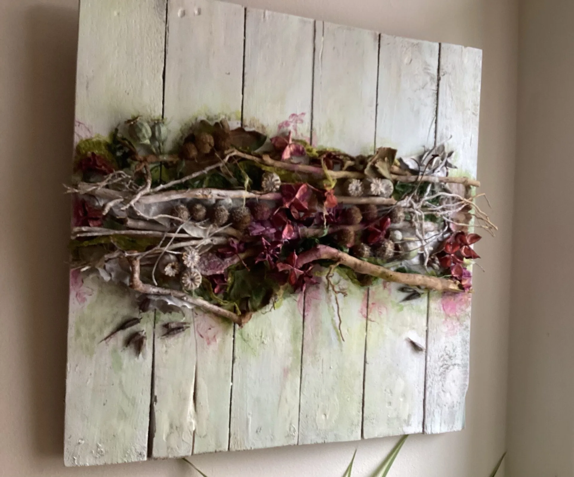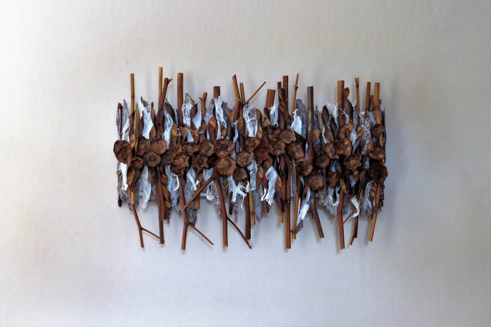 Met natuurlijke materialen zoals blad, schors, zaaddozen en takken maak ik composities.