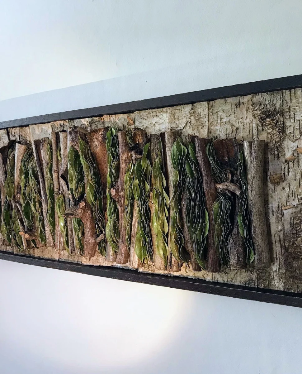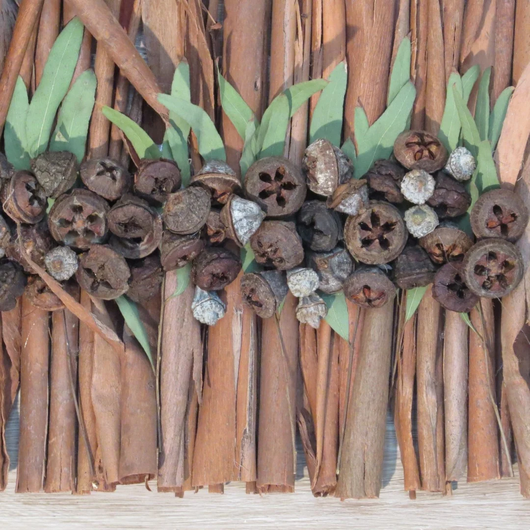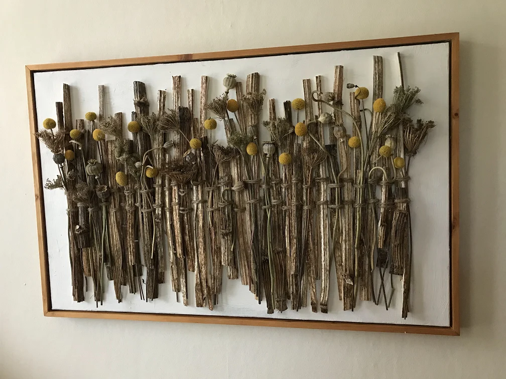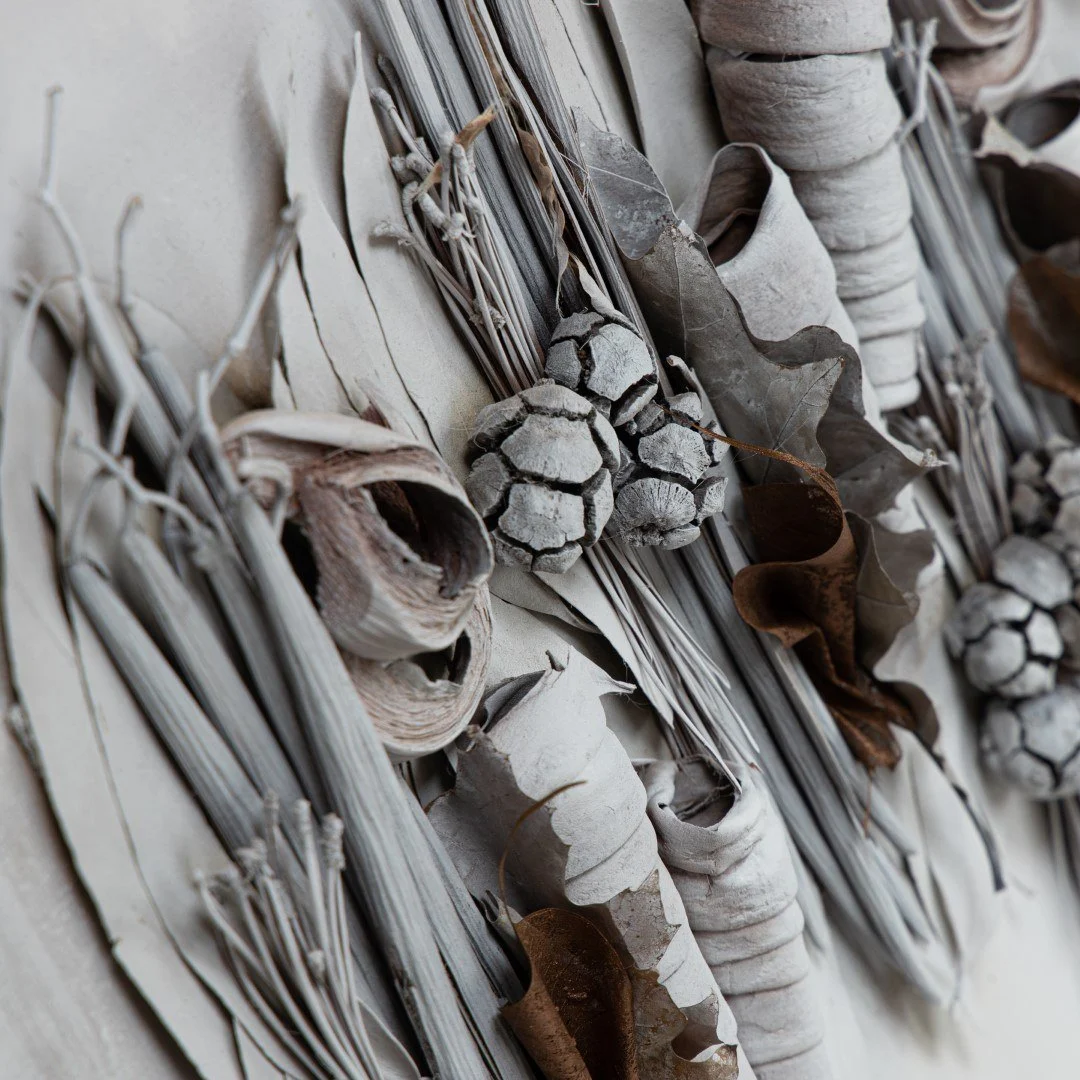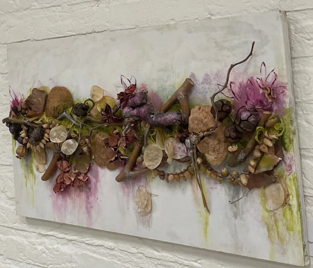 Met natuurlijke materialen zoals blad, schors, zaaddozen en takken maak ik composities.